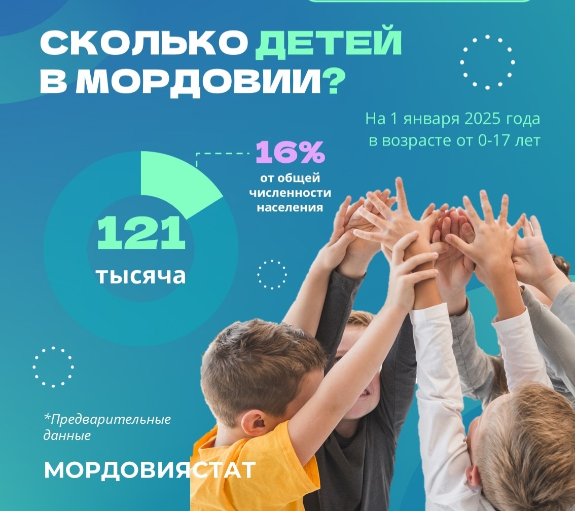 На начало 2025 года, по данным Мордовиястат, vk.com/mordoviastat, в Республике Мордовия проживает 121 тыс. детей в возрасте от 0 до 17 лет.